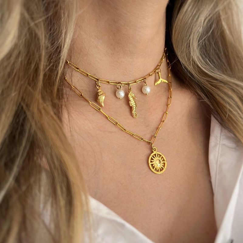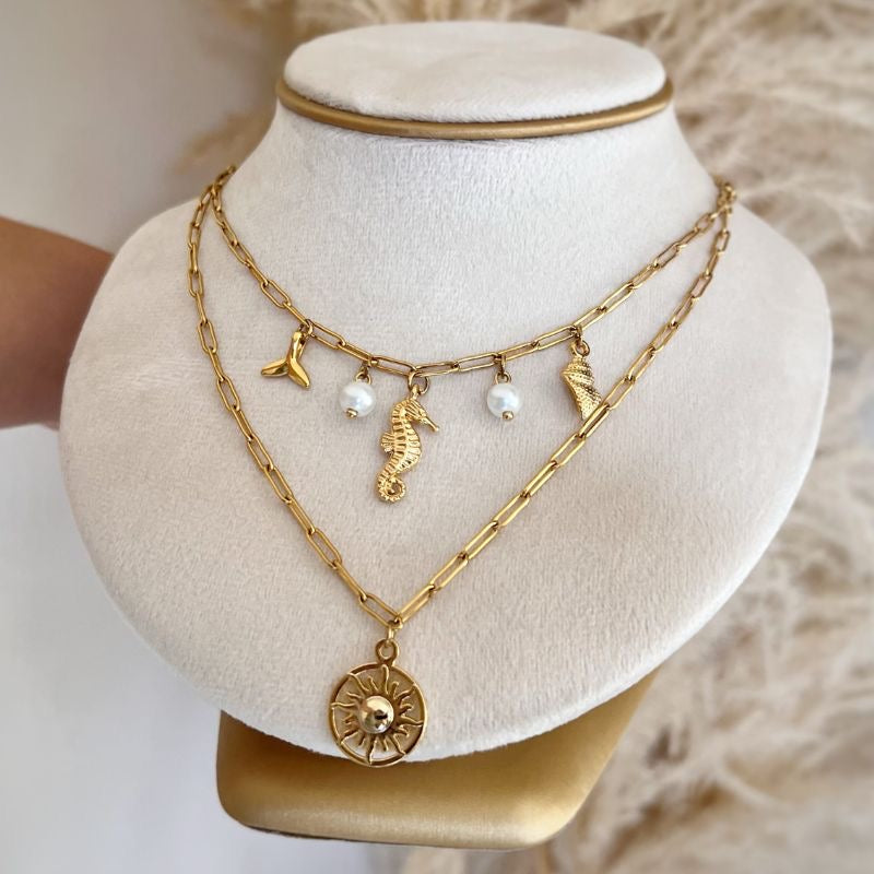 Inspired by the beauty of the sea, Lamar is a two-layer gold necklace featuring ocean-inspired charms and a sun medallion pendant. A perfect blend of beachy elegance and timeless sophistication.