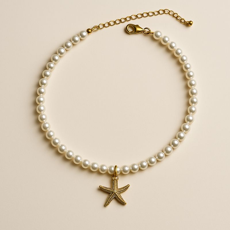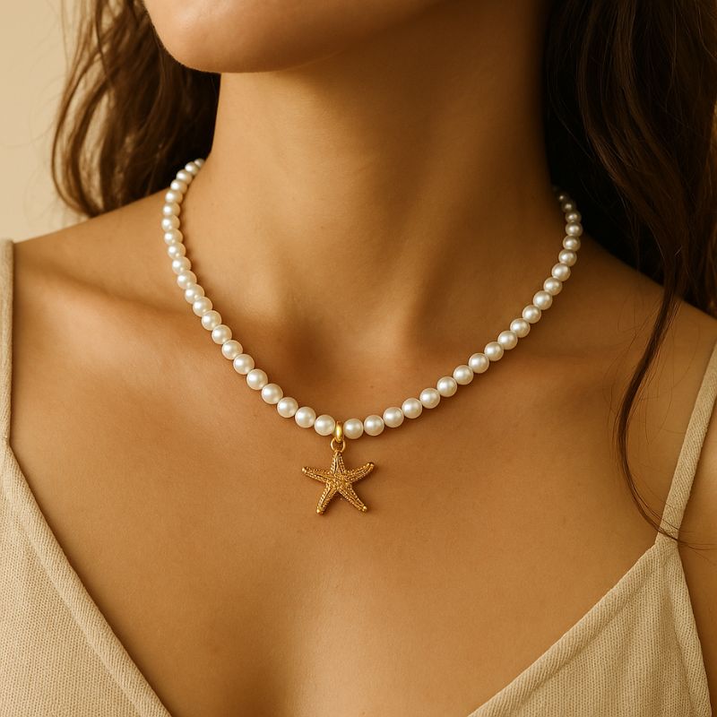 Pearl Choker with Starfish- Marine Charm and Timeless Elegance: Bring the magic of the ocean with you with our delicate pearl choker with starfish charm, a piece that combines the classic sophistication of pearls with a fresh, summery touch. Perfect for those looking for a unique accessory that adds personality and style to any outfit.