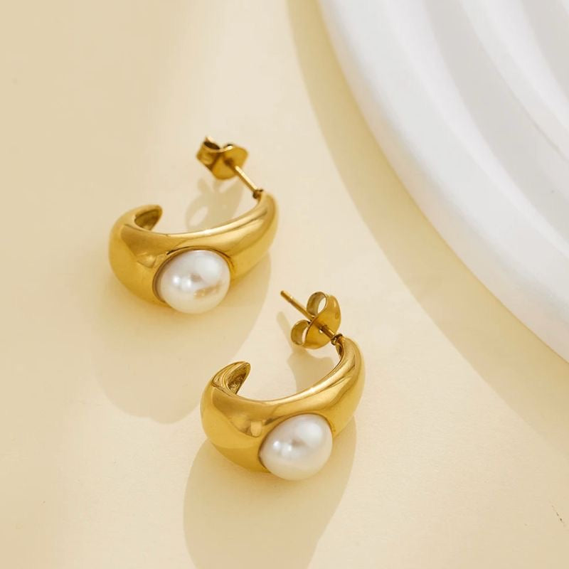 Make a bold statement with España, featuring chunky gold crescent hoops adorned with a glass pearl charm. Designed for those who love eye-catching yet sophisticated accessories.